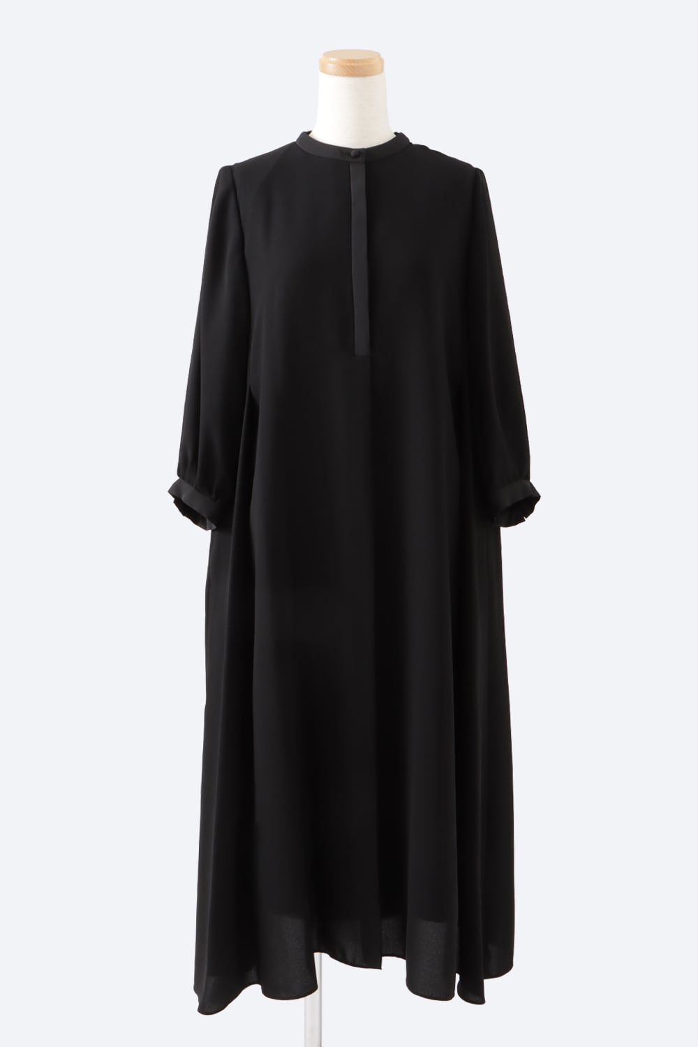 素材は高減量加工で程よい肉感で透けにくく、ソフトでパウダリーな肌触りの良い素材感です。小さなバンドカラーと釦を隠し、スッキリとした比翼仕立て部分はやや光沢感を持たせた別布でアクセントとなる表情を持たせました。両脇に取った深いタックで動きのある分量感を持たせ、エレガントなシルエットと同時に体型をさりげなくカバーできるフォルムになっています。袖口部分と後身頃にタック+ギャザーディテールを施し、シンプルながらもポイントを持たすデザイン性をプラスしました。ちょっとしたものが入るように小さなシームポケットを付けました。シーズンレスに着用できるワンピースです。何よりもウォッシャブル素材なので家庭で手洗いして頂けます。